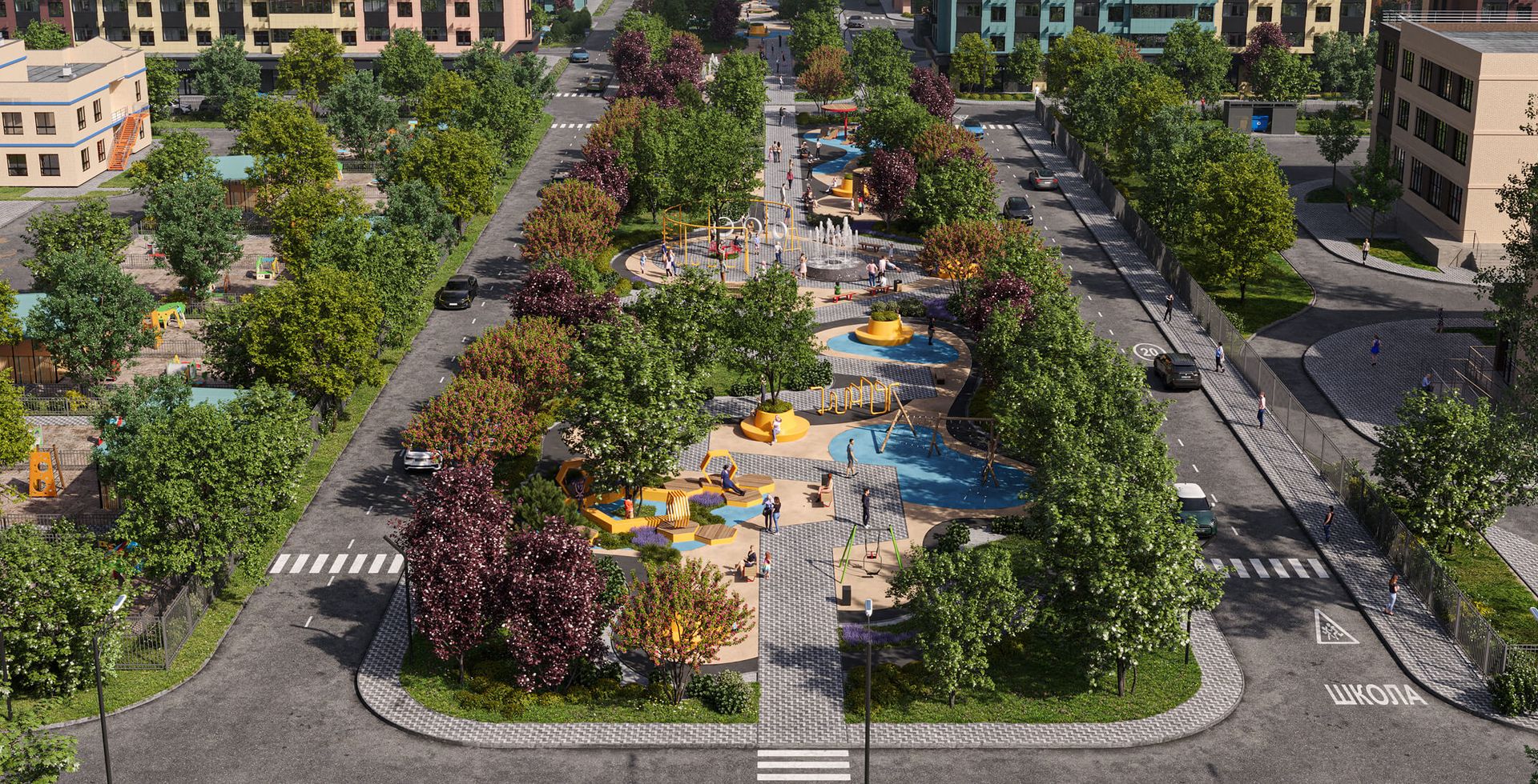 В концепции благоустройства заложена идея единого динамичного пространства, которое создаётся через несимметричные линии пешеходных дорожек и аллей, направляющих жителей от одной зоны отдыха к другой.
